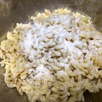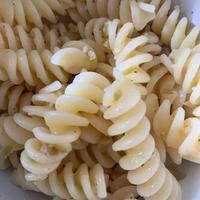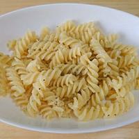 茹で時間はパッケージの表記に従って下さい。今回はアルデンテに仕上げるため1分短く茹でています。 通常はフジッリを茹で上げてからソース等で絡めるところ、このレシピは茹でながら味を染みこませて作る為、茹でるお湯の量も通常より少なめにして作っています。 黒こしょうの量が多いので、お好みで調節してください。