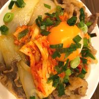 あまからーい牛丼と、ピリッとして酸味の効いたキムチが相性抜群! 卵黄と絡めて食べることで、味がまろやかになり、時間がないときでも簡単にできてガッツリ食べられるメニューです! 昼食や夕食に是非お試しください。