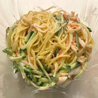 - 2 きゅうりは斜め薄切りにし、千切りにします。カニカマは手で割きます。