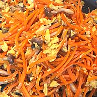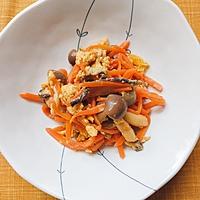 先ににんじんレンチン(5分30)してしんなりしているのでごま油ひいたら、椎茸とにんじん同時に炒める→調味料→かき混ぜた玉子はよけたりせず、上からそのまま入れる