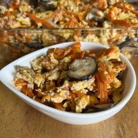 きのこの食感と旨味がアクセントとなり、にんじんの自然な甘みと相性抜群です。しいたけ、えのき、しめじなど好みのきのこを組み合わせて作れます。シンプルな調理法ながら、ごはんが進む素朴な味わいが魅力的。卵を加えることで優しい味わいと食感が生まれ、冷めても美味しく副菜として重宝します。にんじんを切る以外は手間もかからず、食物繊維もたっぷり取れる健康的な一品です。