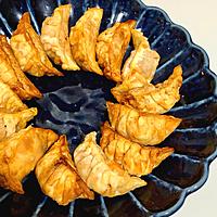 - 2 餃子の皮に1とクリームチーズをのせ、ふちにのり用の水をつけ餃子の形に包みます。