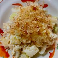 - 2 豆腐をキッチンペーパーに包み、耐熱皿にのせ、500Wの電子レンジで1分半加熱し、粗熱が取れたら一口大に崩します。