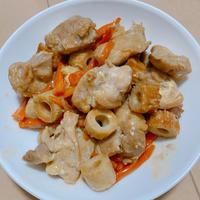 冷蔵庫にあったちくわとにんじんを使って作りました。ニンニク入れ忘れてしまった...。マヨを少し足してみましたが、濃厚になって美味しかったです!お肉は長めに蒸し焼きにしたところ、ぷりぷりになりました。