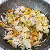 - 4 3に野菜と塩こしょうを加えて中火で炒め、火が通ったら(A)を加え、強火でさっと和えたら完成です。