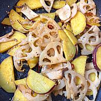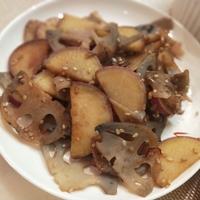 - 4 レンコンとさつまいもに火が通ったら中火のまま、(A)を入れ炒め合わせます。
