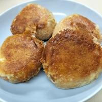 - 3 中火で熱したフライパンにサラダ油をひき、ピザ用チーズを4等分におきます。2をのせ、チーズが溶け焼き色がつくまで2分ほど焼きます。