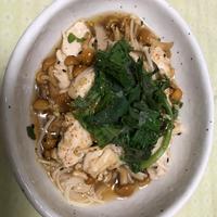 なめこがあったのがきっかけです。残りの野菜を使用、まいたけの代わりにえのきとしいたけ、水菜の代わりに春菊、大葉ものせました。優しい味で美味しかったです。また作ります。