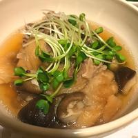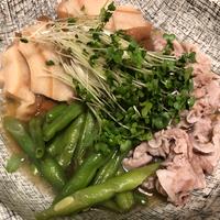 牛肉があまり好きじゃないので豚肩ロース肉のしゃぶしゃぶ用を使用し、椎茸がなかったのでエンドウマメを使いました。