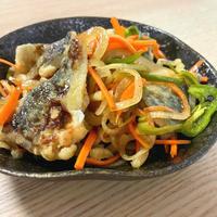 - 3 サバは両面に塩をふって5分程置き、キッチンペーパーで水気を拭き取ります。一口大に切り、全体に片栗粉をまぶします。