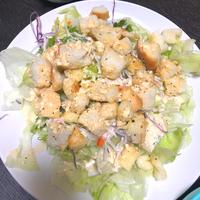 余った食パンで、ちょっぴりお洒落なカフェ風サラダはいかがでしょうか。 ガーリック風味のラスクとお手製のフレンチドレッシングが、シャキシャキの野菜に相性抜群です。 彩りも綺麗なので、ぜひ作ってみてくださいね。