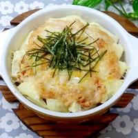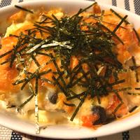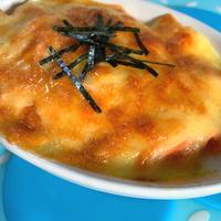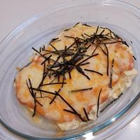 - 3 別の耐熱皿に2を入れてスプーンで粗く崩し、1をかけ、ピザ用チーズをのせます。チーズに焼き色がつくまでオーブントースターで10分程焼きます。