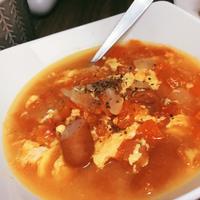 トマトとにんにくのスープのご紹介です。ふんわりとしたかき玉とトマトの酸味がナイスバランス。暑い日に是非食べて欲しいメニューです。辛いものが好きな方はタバスコをかけてもおいしいですよ。