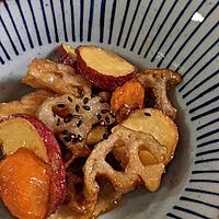 片栗粉をまぶしすぎてとろみがつき過ぎてしまったので次回作る時は片栗粉少なめか、さつまいもや蓮根は素揚げでも良さそう!