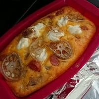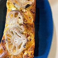 レンコンが沢山あったので。 具材の置き方の順番を間違えて、バタバタやり直したせいで、きれいな断面にならず残念。 焼き時間5分追加、不安になってもう5分追加したが、これは不要だった。「塩少々」が少な過ぎたが、とても美味しくでき、朝食にピッタリ!