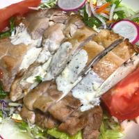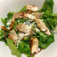 チキンソテーのシーザーサラダのご紹介です。すりおろしニンニクの風味がしっかり付いた鶏もも肉をジューシーに焼き上げ、手作りのシーザーサラダドレッシングとともにいただく、ボリューム満点のサラダです。ぜひ、お試し下さい。