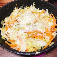 - 2 中火で熱したフライパンにサラダ油をひき、1を入れて炒めます。全体に油がなじんだら(A)を加えてキャベツがしんなりするまで炒めます。