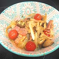 - 4 フライパンに2とオリーブオイルを入れて温め、ニンニクの香りが立ったら3とミニトマトを加え中火で炒めます。