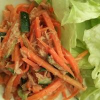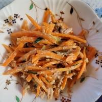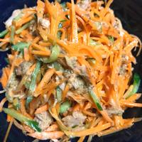 まるごと1本のにんじんをたっぷり食べることができる、簡単でとてもおいしいサラダのご紹介です。練りごまを入れることによって、ごまの風味が効いていて、千切りにしたにんじんときゅうり、ツナと良く合います。ぜひ、作ってみてくださいね。