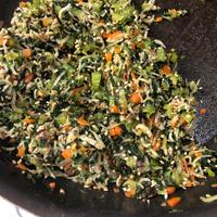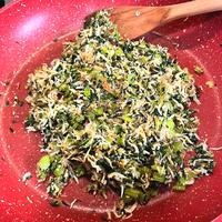 - 3 小松菜に火が通りしんなりしたら釜揚げしらすを入れ中火で炒めます。