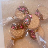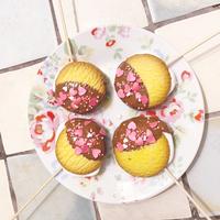 - 2 マシュマロが熱いうちに残りのビスケットをのせ、木のスティックを差しこみ粗熱を取ります。