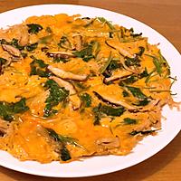 - 3 しらうおが白くなり火が通ったら、溶き卵を回し入れ、1をちらし、蓋をして中火のまま10秒加熱し、火からおろします。