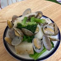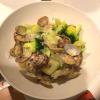 アサリとブロッコリーに山芋としめじも加えてみました。山芋は熱を通すとホクホク感が出て好きです。酒の代わりにオリーブオイルで、味付けはアサリの塩気だけでもいけます。