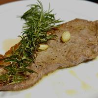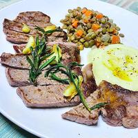 - 8 器に6を盛り付け、7のニンニク、ローズマリーをのせ、オイルをかけます。フライドポテトを添えて完成です。