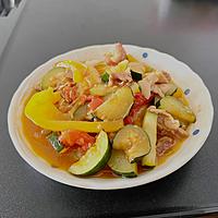 - 5 ズッキーニとパプリカを入れてしんなりするまで炒めたら、(A)とトマトを入れて中火で更に炒めます。