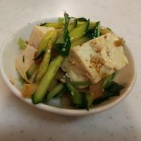 - 1 絹ごし豆腐はキッチンペーパーで包んで600Wの電子レンジで2分加熱し、水気を切ってから一口大に切り、きゅうりはヘタを取って千切りにします。