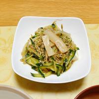- 4 3に1と水気を切った2、メンマを入れて和え、白いりごまをかけてお皿に盛りつけ完成です。