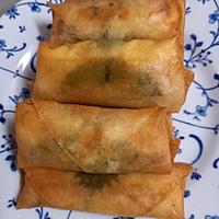 - 2 春巻きの皮を広げます。真ん中より少し手前に、1、えごま、梅肉、ピザ用チーズをのせ、巻き終わりに水溶き薄力粉を塗り、軽く押さえます。同様に5つ作ります。