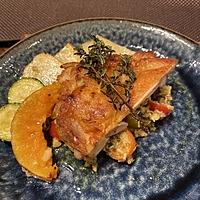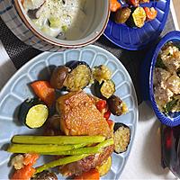 鶏もも肉はオーブン150℃で1時間焼くレシピに変えましたが、付け合わせを参考にさせていただきました☺️
