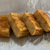 想像以上にふわふわして甘くて幸せになれるパウンドケーキケーキでした。バターを80グラムにしてグラニュー糖を65グラムにしたんだけど、キャラメルとバナナの甘味が強いので次回は40グラムくらいまで減らそうと思う。また絶対に作る!