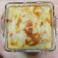 - 5 耐熱皿に4を入れ、2を乗せ、ピザ用チーズを散らしたら、オーブントースターで10分ほど焼きます。