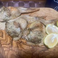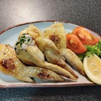骨抜きに苦戦しました。キャベツ、ニラを塩で揉み込んで水分絞り肉ダネに混ぜました!フライパンにごま油で皮から焼いて、こんがり焼けたらひっくり返し、大さじ1杯の水をかけて蓋をし、4分ほど蒸し焼きにしました。レモン絞ってかけて食べても美味しかったです!