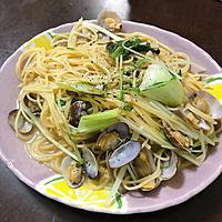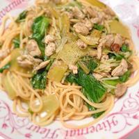 あさりは水煮缶3缶で、水菜1束と家にあったチンゲン菜2株を使いました。チンゲン菜は茎の所が固いので、ニンニクの香りがしてきたら先に茎を入れて炒めてから白ワインを250ccくらい入れました。パスタを3束入れたらチンゲン菜の葉っぱと水菜、醤油大さじ2はい、白だし小さじ1、ゆで汁100cc、ブラックペッパーで味を整えました。これは3人分です。