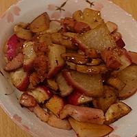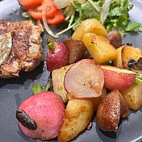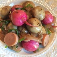 美味しい!野菜が活きる!根菜でもこんなに楽しめるなんて。じゃがいもはもちもちこってり、ラディッシュはジュワッとジューシー。ソーセージで代用、マッシュルームは刻んで冷凍していたものを利用色鮮やかで華やかな夜ご飯の一品になりました