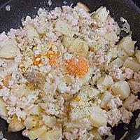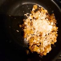 - 3 フライパンを熱し、サラダ油をひき、鶏ひき肉を中火で炒め、肉の色が変わったら玉ねぎを入れ中火で炒めます。