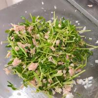個人的に豆苗の茎が苦手な為、豆苗の切り方はレシピ動画より短くカットしました。ツナはオイル漬けを使用、玉ねぎは無かったので入れていません。