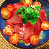 カツオの刺身を使ってエスニック風味のサラダ仕立てにしました。今回はたたきを使いましたが、赤身を使ってもおいしく作れます。ナンプラーとレモン汁を使っているのでエスニックな風味でありながら、なじみのあるポン酢の風味もあってとても食べやすいです。ぜひお試しください。