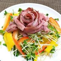 華やかなローストビーフサラダのご紹介です。旨味たっぷりのローストビーフに、シャキシャキした野菜がよく合います。玉ねぎとピリ辛なわさびがアクセントになった和風ドレッシングでさっぱりと召し上がれます。是非お試しください。