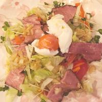 ローストビーフサラダの真ん中に卵をトッピングして、盛り付けてみました❗️とっても美味しかった❗️ヘルシーで、簡単料理万歳です🙌
