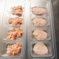 サーモンのお刺身を使いました。茹でてほぐしたもの(お粥に入れてあげる)と、茹でてホワイトソースで和えた物を作りました。喜んで食べてくれました。