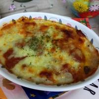 - 5 耐熱皿に2、4、ミートソース、ピザ用チーズをのせ、オーブントースターでチーズが溶けるまで5分焼きます。