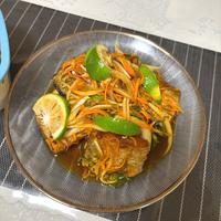 - 1 にんじん、ピーマンは細切りにします。玉ねぎは薄切りにします。