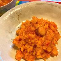 米は洗わずにそのまま炒めて炊くことで粘りが少なく仕上がりますが、気になる方は一度洗ってザルに上げておいたものを使ってください。無洗米でもよいです。 加熱時間は米の芯が少し残る硬めの仕上がりの目安時間です。お好みで調節してください。 トマト缶の代わりに生のトマトを加えても構いません。その場合は水の量を調節してください。