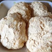 - 4 すりごまはバットの中で2を全体にまぶすように付けます