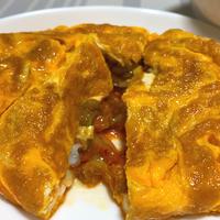 - 3 卵が半熟状になったら、1を入れ、卵で包みます。