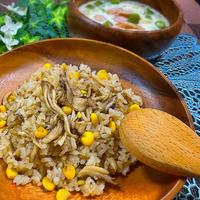 バター醤油味にコーンの甘みがプラスされて、優しいお味の混ぜご飯に♥